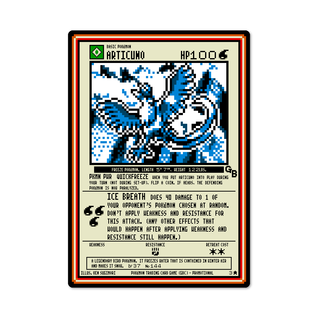 Articuno #3 custom card from the Promotional Series, designed in the style of the original Pokémon Trading Card Game. Features graphics from the 2000 Nintendo Game Boy Color game and is based on the in-game version of the official TCG card.