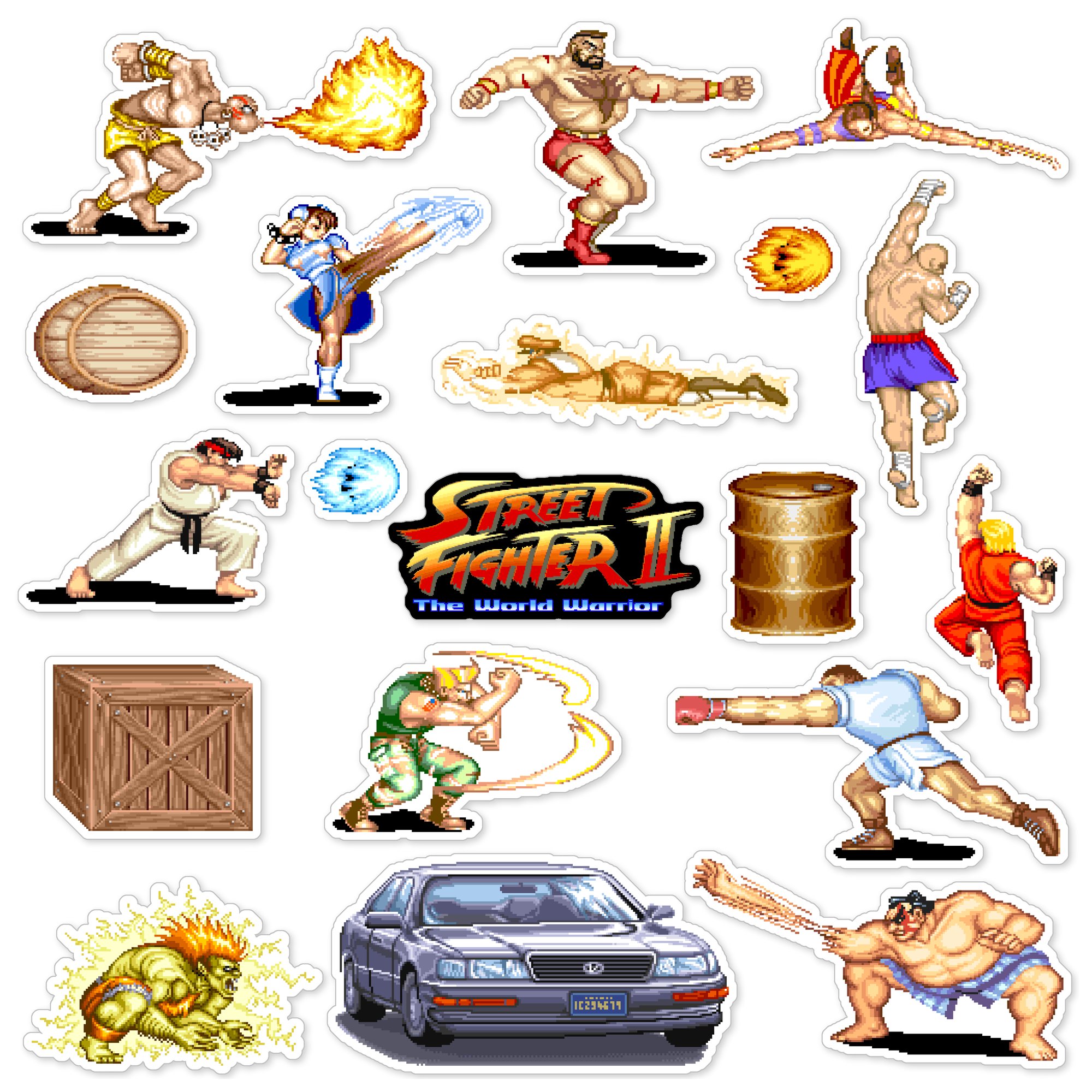 Made to order 19-piece Street Fighter II vinyl sticker set features characters from the 1991 Capcom arcade game.